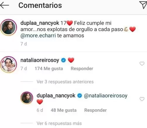 La cantante, que estuvo en pareja durante cinco años con el actor, demostró toda la admiración que le tiene dejándole un emoji de un corazón. “17. Feliz cumple, mi amor. Nos explotás de orgullo a casa paso. Te amamos”, escribió Dupláa junto a una foto de su hija. Y al ver el mensaje de Natalia Oreiro, Nancy le respondió con el mismo corazón.