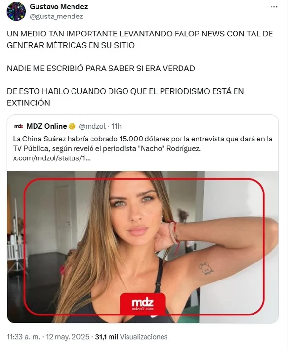 "Un medio tan importante levantando falop news con tal de generar métricas en su sitio", se quejó Méndez en redes sociales, apuntando contra MDZ Online, que publicó la supuesta cifra.