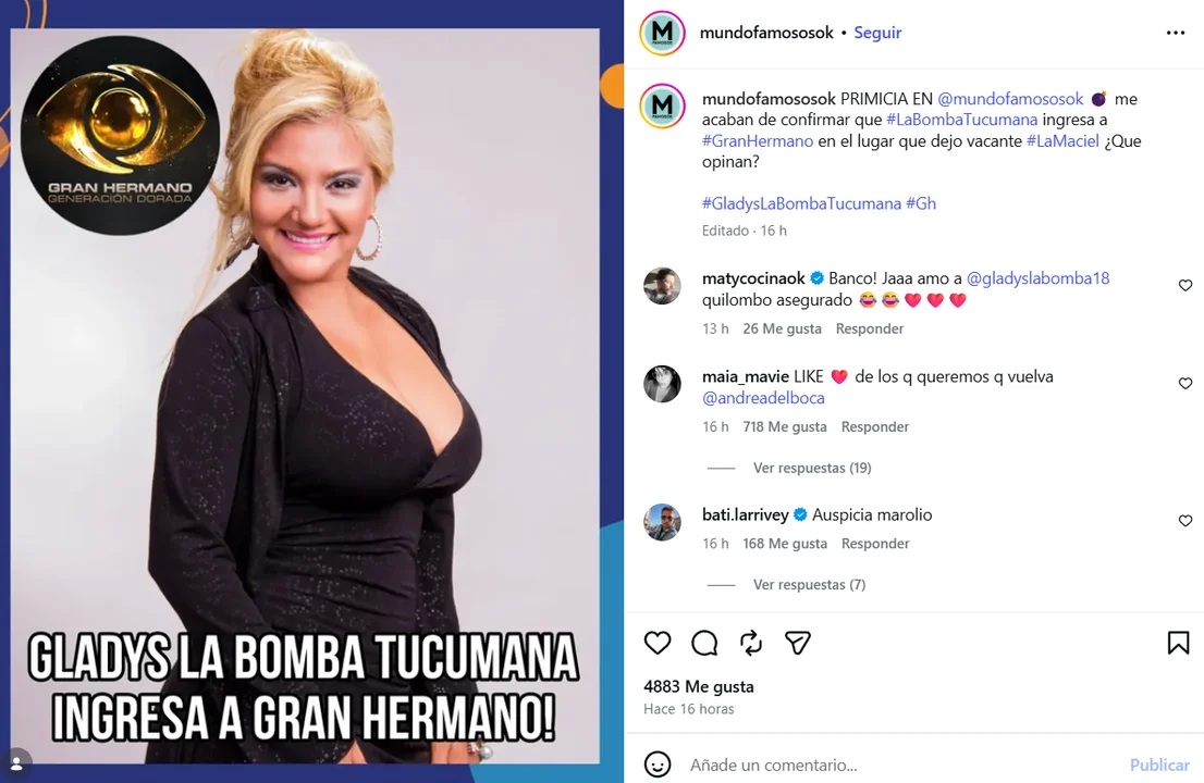 "PRIMICIA EN @mundofamososok 💣 me acaban de confirmar que #LaBombaTucumana ingresa a #GranHermano en el lugar que dejo vacante #LaMaciel".