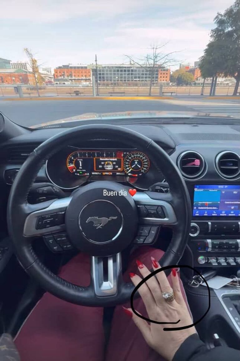 La versión de noviazgo se sostiene en dos indicios: ambos lucen un anillo idéntico y fueron fotografiados mientras usaban el mismo Ford Mustang ploteado, cuya patente coincide en los posteos de cada uno.