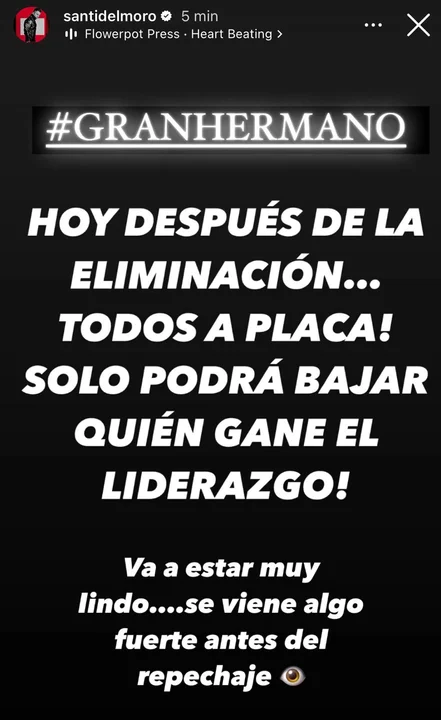 "Hoy después de la eliminación... ¡todos a placa! Solo podrá bajar quien gane el liderazgo", anunció Del Moro, quien anticipó que "va a estar muy lindo, se viene algo fuerte antes del repechaje".