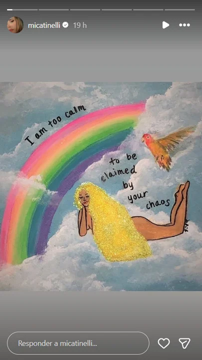 A través de su cuenta de Instagram, la diseñadora de moda posteó una curiosa historia de un dibujo de una mujer recostada en una nube, con un arcoíris de fondo y una frase peculiar: "Estoy muy calmada para ser arrastrada por tu caos".