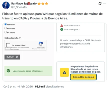 "Pido un fuerte aplauso para WN que pagó los 16 millones de multas de tránsito en CABA y Provincia de Buenos Aires", reveló el periodista.