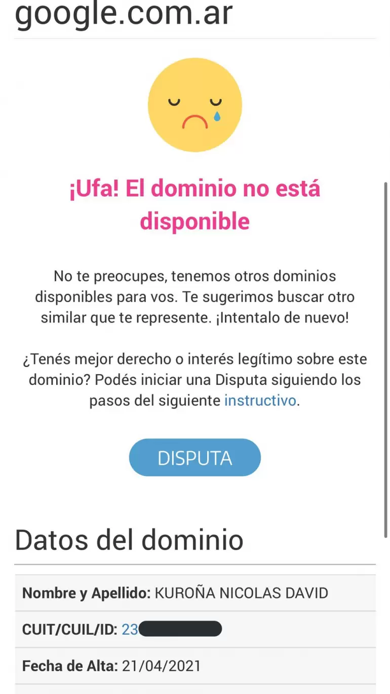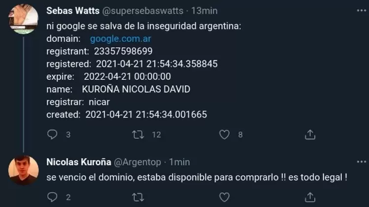 Pasadas las 22.30, la página del buscador más popular del mundo no funcionaba y en redes sociales se viralizó la falla que presentó el sitio de Google en el país. “No se puede acceder a este sitio web”, era la leyenda que figuraba al intentar ingresar. En el ínterin comenzó a circular la versión de que la propiedad del dominio se había vencido. Se viralizó una captura de pantalla de un usuario que buscó google.ar en el sitio Nic Argentina, responsable del registro y administración de los dominios .ar, que depende de la Secretaría Legal y Técnica de la Presidencia de la Nación, y allí se encontró con la sorpresa:. “¡Ufa! El dominio no está disponible”. Había dejado de figurar la razón social de la compañía, reemplazada con los datos del “nuevo dueño”: Nicolás David Kuroña.