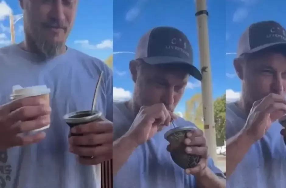 Vestido con look casual -con una remera y gorra-, el actor acababa de comprar un café para llevar cuando se detuvo a saludar a los jóvenes que se presentaron: Patricia, que grabó la secuencia, le explicó en inglés que ellos no eran de aquella ciudad ni de aquel país: él es argentino y ella, uruguaya. Con la bebida en su mano, mostró buena predisposición cuando lo invitaron a probar de su mate, fiel compañero durante su viaje por Australia.
