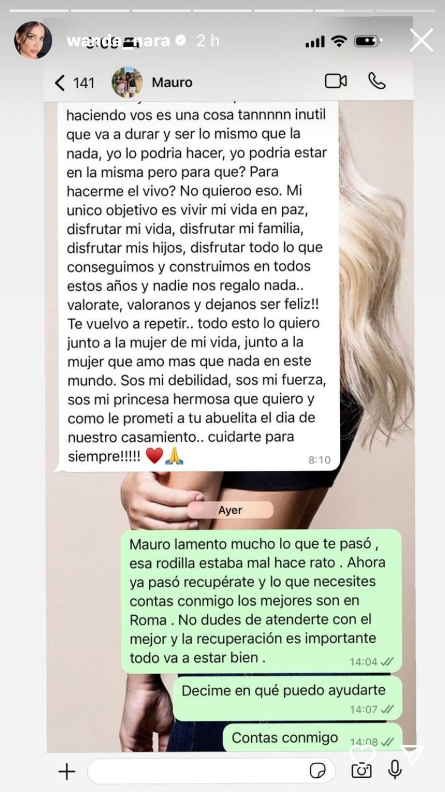 "Ahora ya pasó, recuperate y lo que necesites contás conmigo, los mejores [médicos] son los de Roma. No dudes de atenderte con el mejor y la recuperación es importante", sumó Wanda.