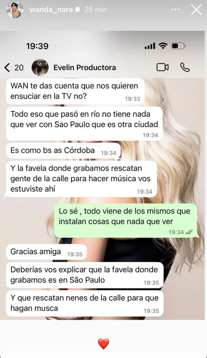 Ante la repercusión del tema, Wanda Nara decidió romper el silencio y publicar una captura de su conversación privada con Evelin, la productora de su videoclip. En la charla, la productora le advierte: "Wan, ¿te das cuenta que nos quieren ensuciar en la TV, no? Todo eso que pasó en Río no tiene nada que ver con São Paulo, que es otra ciudad. Es como Buenos Aires y Córdoba. Y la favela donde grabamos rescata gente de la calle para hacer música".