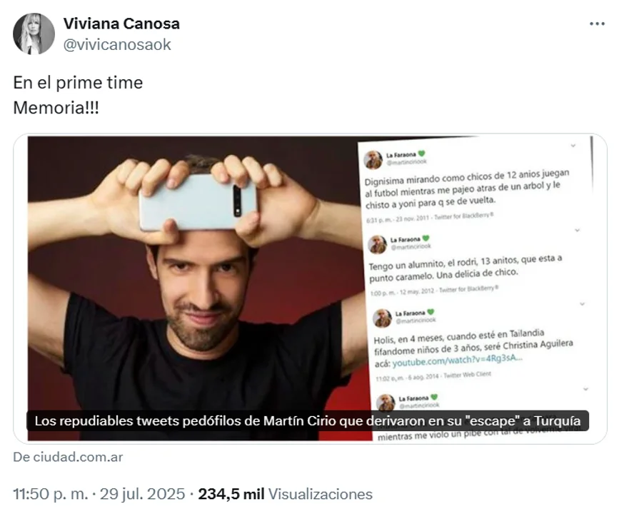"Es una pelotuda por publicar sobre Martín Cirio, aludiendo a una causa de pedofilia en la que la Justicia ya lo sobreseyó", lanzó.