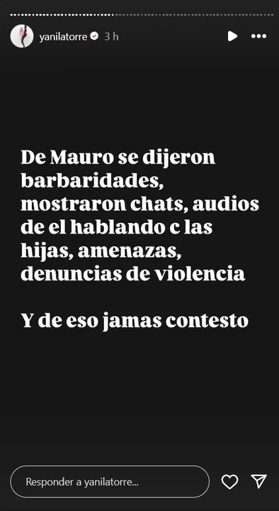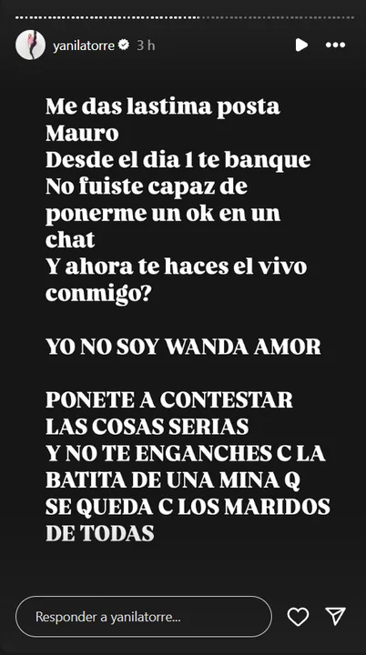 "Me das lástima posta Mauro. Desde el día 1 te banqué. No fuiste capaz de ponerme un ok en un chat y ahora ¿te hacés el vivo conmigo? No soy Wanda amor. Ponete a contestar las cosas serias y no te enganches con la batita de una mina que se queda con los maridos de todos", expresó.