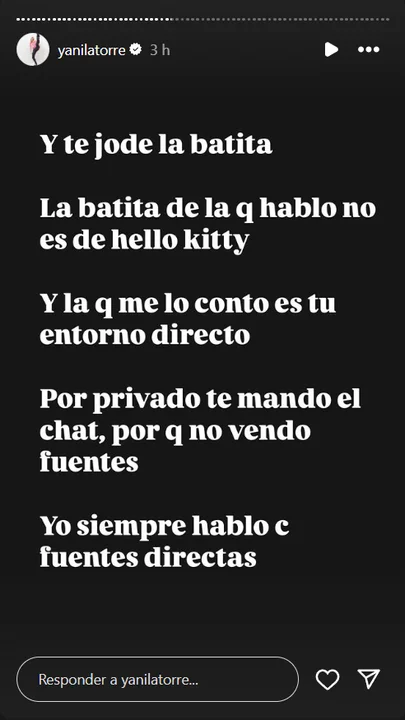 "Y te jode la batita. La batita de la que hablo no es de Hello Kitty y la que me contó es de tu entorno directo. Por privado te mando el chat, porque no vendo fuentes. Yo siempre hablo con fuentes directas", remarcó.