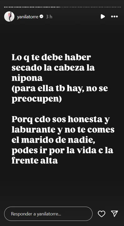 "¿Por qué no hablás de los chats tuyos? ¿Por qué no hablás de todo lo que te acusan? Muchos programas hablando de eso, acusándote de barbaridades y te jode la batita. Lo que te debe haber secado la cabeza la nipona porque, cuando sos honesta y laburante y no te comés al marido de nadie, podés ir por la vida con la frente alta", dijo contundente.