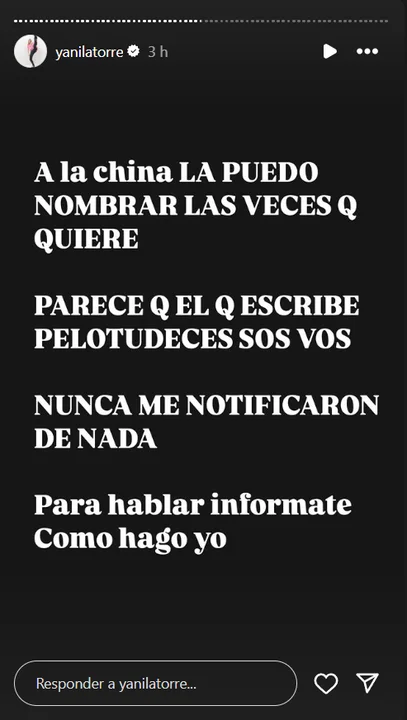 "A la China la puedo nombrar las veces que quiera. Parece que el que escribe pelotudeces sos vos. Nunca me notificaron de nada. Para hablar, informate, como hago yo", escribió.