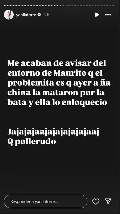 "Me acaban de avisar del entorno de Maurito que el problemita es que ayer a la China la mataron por la bata y ella lo enloqueció. Jajajajaja que pollerudo", señaló.