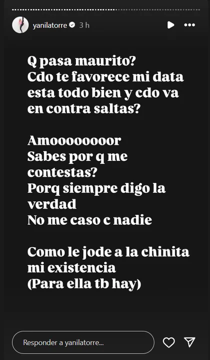 "¿Qué pasa Maurito? ¿Cuando te favorece mi data está todo bien y cuando va en contra saltás? Amooor ¿sabés por qué me contestás? Porque siempre digo la verdad, no me caso con nadie. Cómo le jode a la Chinita mi existencia", aseguró.
