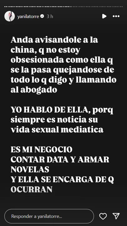 "Andá avisándole a la China que no estoy obsesionada como ella, que se la pasa quejándose de todo lo que digo y llamando al abogado. Yo hablo de ella porque siempre es noticia su vida sexual mediática. Es mi negocio contar data y armar novelas y ella se encarga de que ocurran", se refirió a la actriz.