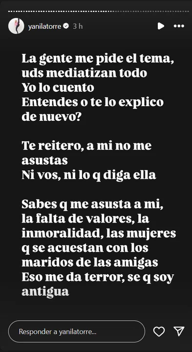 "La gente me pide el tema, ustedes mediatizan todo, yo lo cuento. ¿Entendés o te lo explico de nuevo? Te reitero, a mí no me asustás, ni vos ni lo que diga ella. ¿Sabés qué me asusta a mí? La falta de valores, la inmoralidad, las mujeres que se acuestan con los maridos de las amigas. Eso me da terror, sé que soy antigua", sostuvo.
