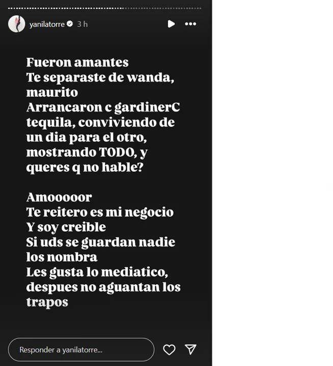 Y siguió: "Fueron amantes, te separaste de Wanda, Maurito. Arrancaron en Gardiner, Tequila, conviviendo de un día para el otro, mostrando TODO, y querés que no hable? Amooor te reitero es mi negocio y soy creíble. Si ustedes se guardan nadie los nombra, les gusta lo mediático, después no aguantan los trapos".
