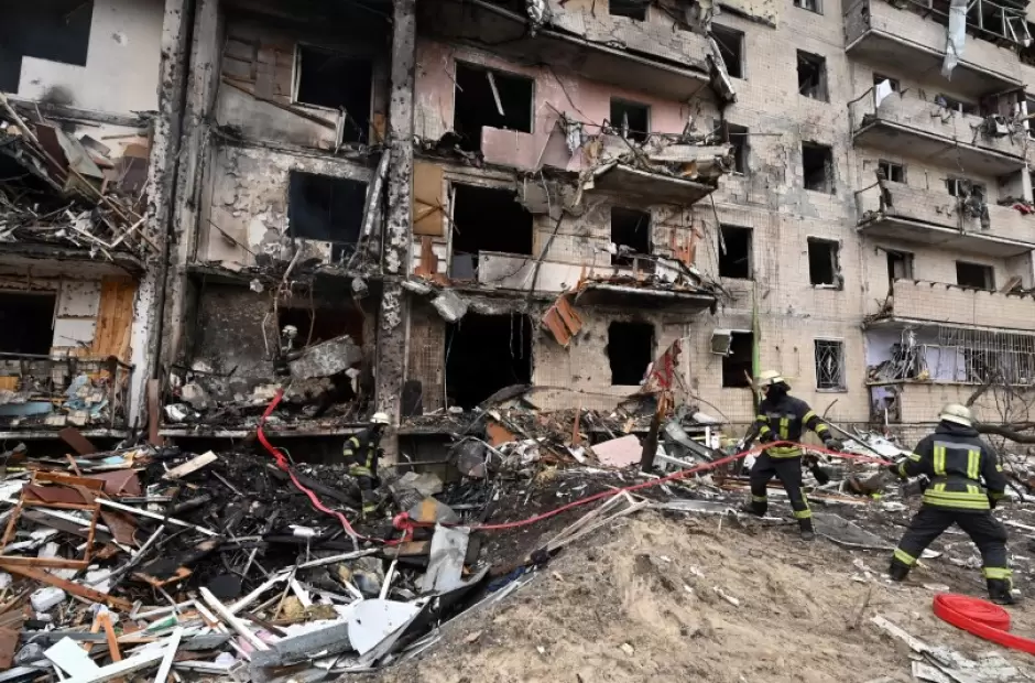 Al menos dos personas murieron y otras tres resultaron heridas después de que un proyectil impactara en la madrugada del lunes contra un edificio de apartamentos en Obolonski, una zona residencial de Kiev, capital de Ucrania.
