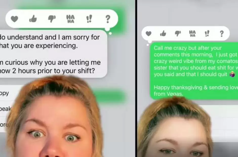Lo que sorprendió a la tiktoker es la respuesta que recibió por parte de su jefa. “Entiendo y siento mucho por lo que estás pasando, pero ¿por qué me avisas dos horas antes de tu horario laboral?”, contestó la mujer.