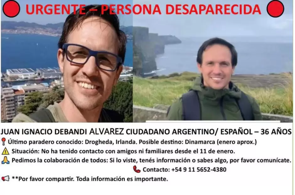 Uno de los mensajes difundidos señala: "Juan Ignacio Debandi Álvarez, ciudadano argentino/español - 36 años. Último paradero conocido: Drogheda, Irlanda. Posible destino: Dinamarca (enero aprox.). Situación: No ha tenido contacto con amigos ni familiares desde el 11 de enero. Pedimos la colaboración de todos: Si lo viste, tenes información o sabes algo, por favor, comunícate".