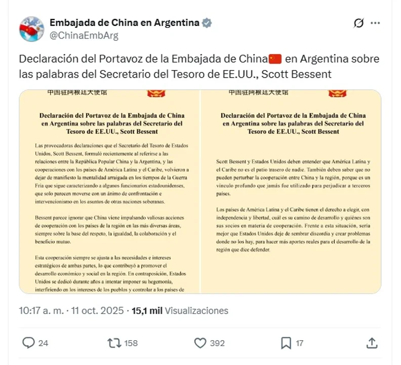 El pasado sábado 11 de octubre de 2025, la Embajada de China en Argentina sentenció que las "provocadoras declaraciones que el Secretario del Tesoro de Estados Unidos, Scott Bessent, formuló recientemente al referirse a las relaciones entre la República Popular China y la Argentina, y las cooperaciones con los países de América Latina y el Caribe, volvieron a dejar de manifiesto la mentalidad arraigada en los tiempos de la Guerra Fría que sigue caracterizando a algunos funcionarios estadounidenses".