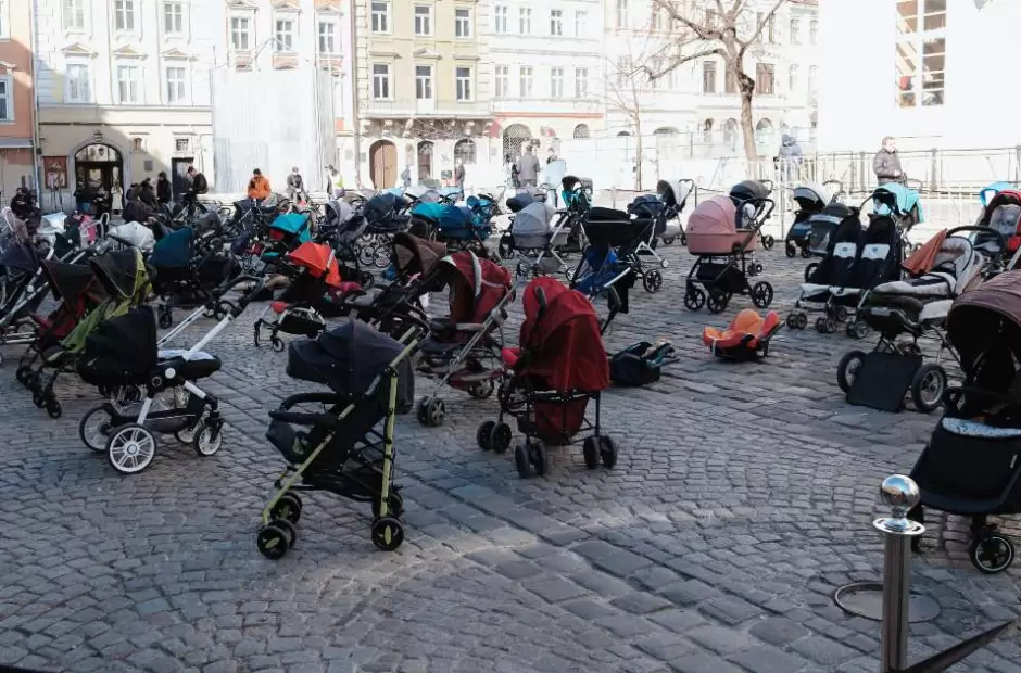 Mientras Ucrania llora a sus muertos, decenas de cochecitos vacíos fueron alineados en la plaza central adoquinada de la ciudad de Leópolis el viernes para conmemorar a los niños asesinados en el país desde la invasión de Rusia.