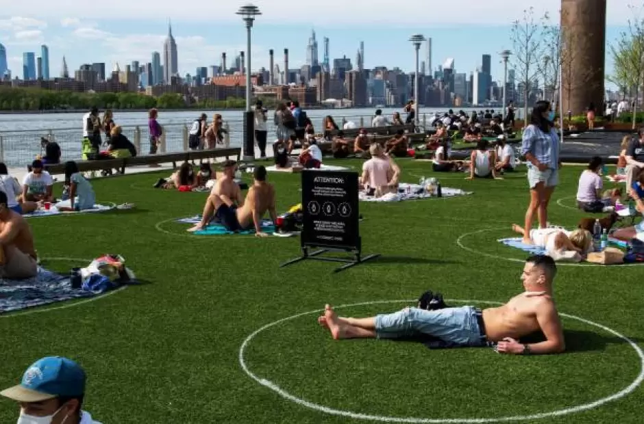 Como parte de las nuevas medidas anunciadas por el alcalde de la ciudad de Nueva York, Bill de Blasio, varios círculos fueron dibujados en el césped del Domino Park, en Brooklyn, para mantener la distancia de 1,5 metros requerida entre los visitantes.