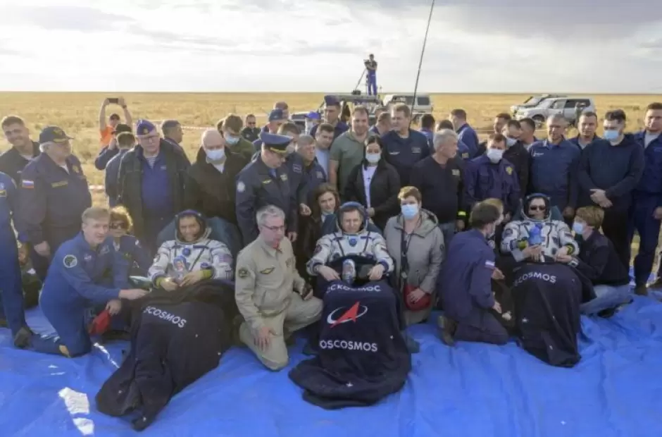 Prokopyev dijo a los controladores de tierra durante el descenso que los tres se sentían bien. Experimentaron más de cuatro veces la fuerza de la gravedad cuando la cápsula atravesó la atmósfera y aterrizó en las áridas estepas kazajas. Los helicópteros se desplazaron con equipos de recuperación para recoger a los astronautas.