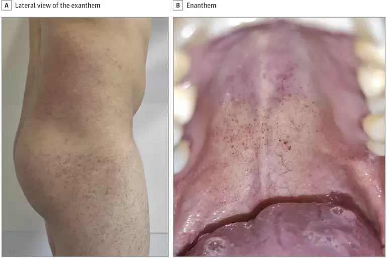 El informe publicado en JAMA, una de las revistas más prestigiosas del mundo médico, continuó: “El tiempo medio entre el inicio de los síntomas de COVID-19 y la aparición de lesiones mucocutáneas fue de 12,3 días. Curiosamente, esta latencia fue más corta en pacientes con enantema en comparación con aquellos con una lesión macular con apariencia de petequias. La ingesta de drogas y los hallazgos de laboratorio no se asociaron con ningún tipo de enantema”.