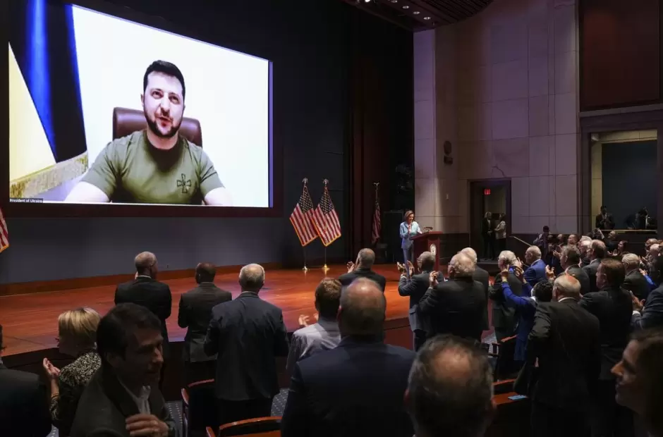 El presidente ucraniano buscó tocar la fibra íntima de la Casa Blanca y de los congresistas estadounidenses que lo aplaudieron de pie desde el salón de conferencias del Congreso en Washington, donde se instaló una enorme pantalla de video para seguir el mensaje desde Kiev.