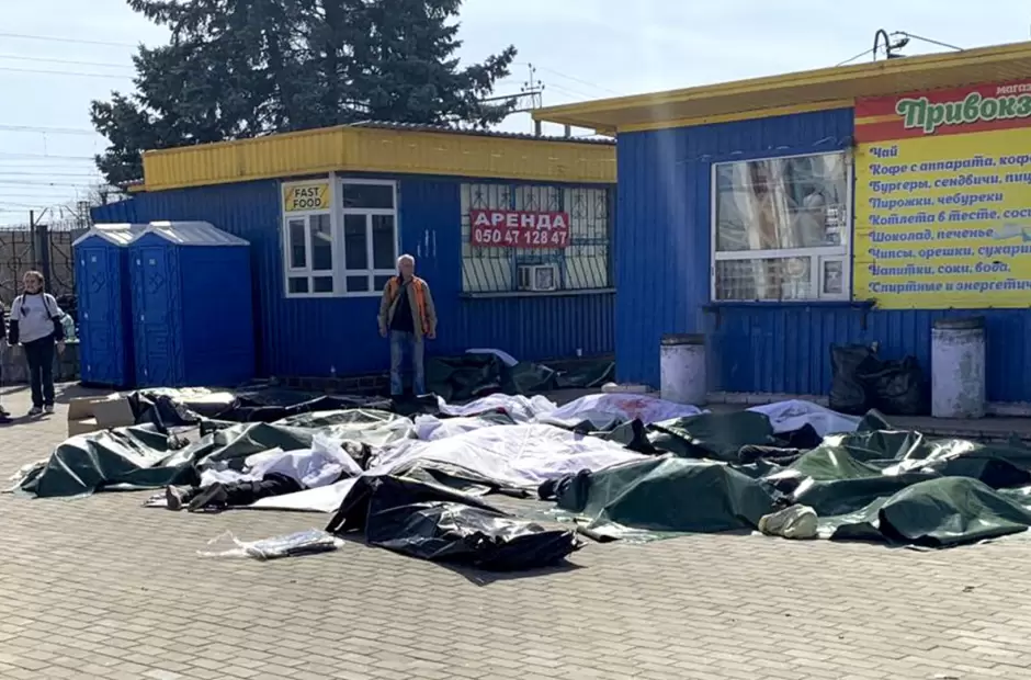 Los cuerpos de las personas que murieron el ataque ruso contra la estación de trenes (Hervé BAR / AFP)