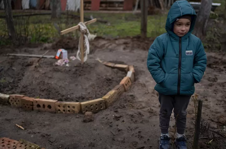 El fotógrafo también capturó la mirada vacía de Vlad Tanyuk, de seis años, hermano de Vova e hijo de Ira. Enfundado en una campera verde con capucha, con las manos en los bolsillos y la cabeza inclinada hacia abajo, parado delante de donde descansa hoy su madre, no miró la cámara de Rodrigo, pero sabía que le estaba sacando una foto.