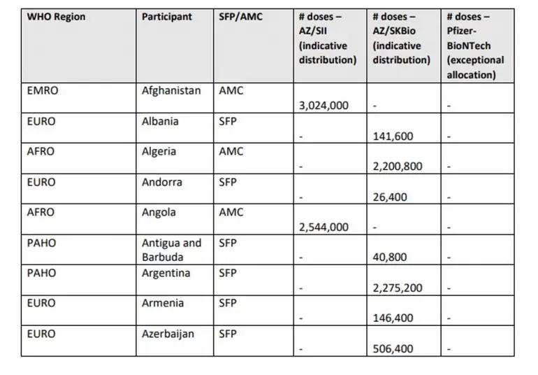 La Organización Mundial de la Salud (OMS) difundió este miércoles las primeras cifras de las dosis que fueron asignadas a los países participantes del sistema internacional Covax, entre los que se encuentra la Argentina.