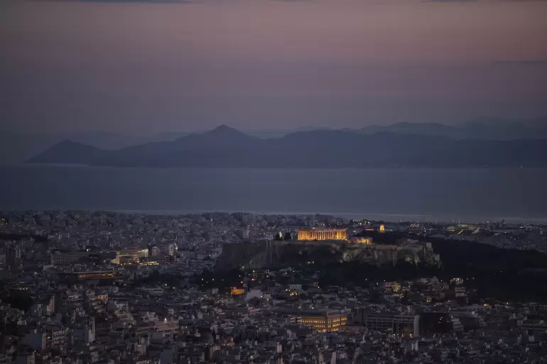 La Acrópolis de Atenas, Grecia, iluminada mientras la isla de Aegina se alza en el fondo y detrás de ella las distantes costas de la península del Peloponeso, el viernes 24 de abril (Foto AP / Petros Giannakouris)