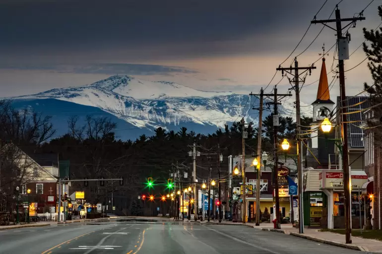 El Monte Washington se cierne en la distancia sobre el pintoresco North Conway, en New Hampshire, EEUU, donde la mayoría de las pequeñas tiendas e iglesias permanecen cerradas durante la pandemia, el domingo 26 de abril de 2020 (Foto AP / Robert F. Bukaty)