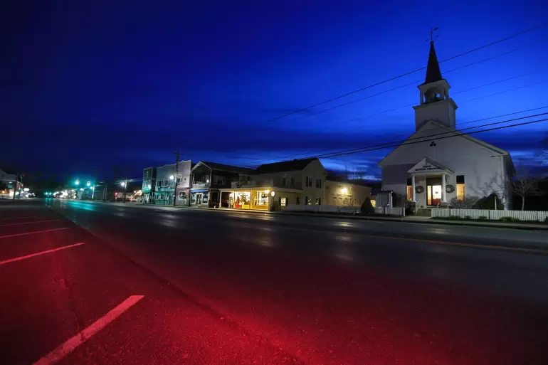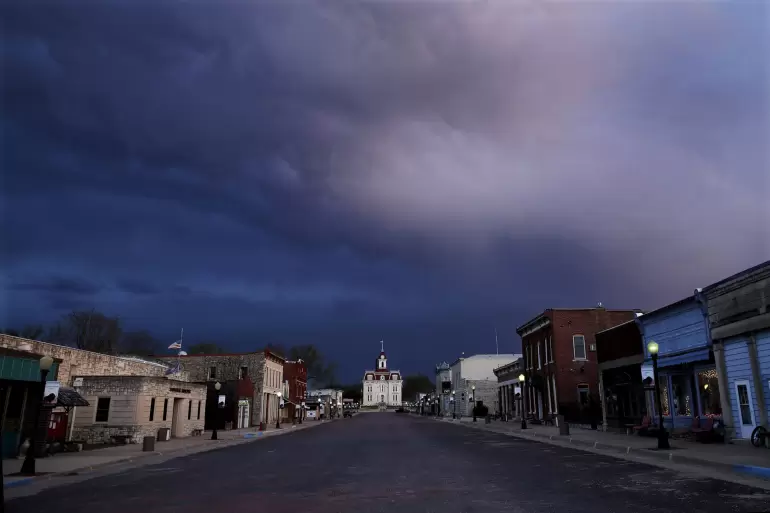 Una calle desierta conduce al histórico Palacio de Justicia del Condado de Chase en Cottonwood Falls, Kansas, EEUU, al anochecer del jueves 23 de abril de 2020 (Foto AP / Charlie Riedel)