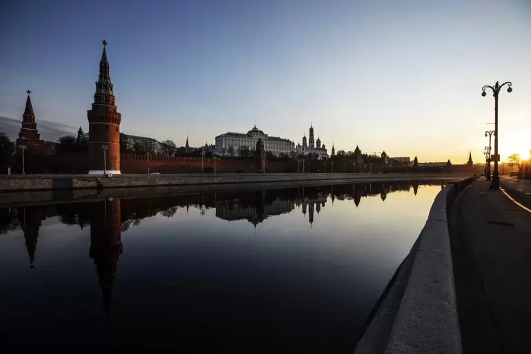 El Kremlin y sus torres se reflejan en el río Moscú a lo largo de un terraplén desierto cuando sale el sol sobre la capital de Rusia, el lunes 27 de abril de 2020. (Foto AP / Alexander Zemlianichenko)