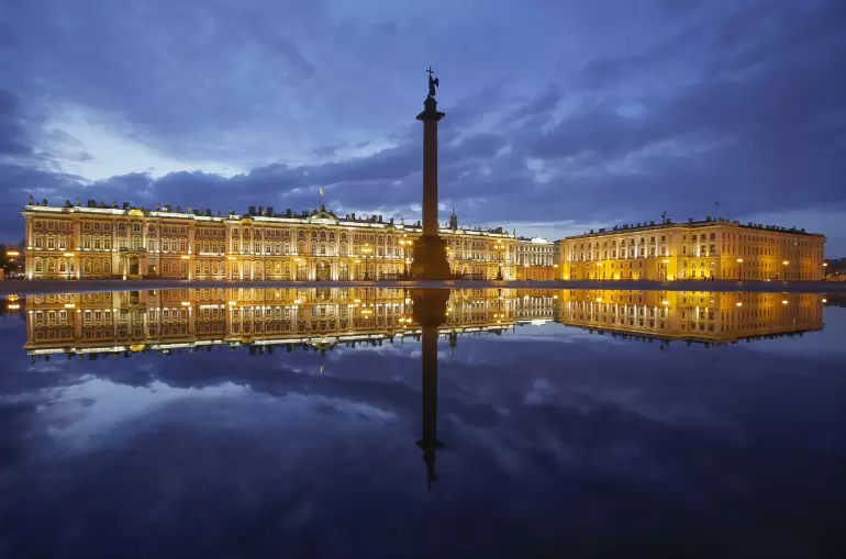 El Palacio de Invierno y la Columna de Alejandro se reflejan en un charco después de la lluvia en la Plaza del Palacio en San Petersburgo, Rusia, el lunes 27 de abril de 2020. (Foto AP / Dmitri Lovetsky)