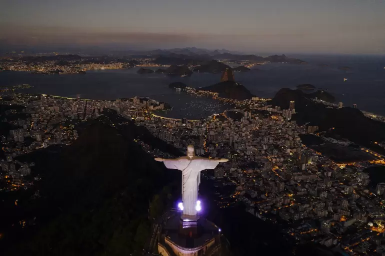 La estatua del Cristo Redentor se alza sobre la bahía de Guanabara durante el anochecer en medio del brote del coronavirus en Río de Janeiro, Brasil, el lunes 27 de abril de 2020. (Foto AP / Leo Correa)