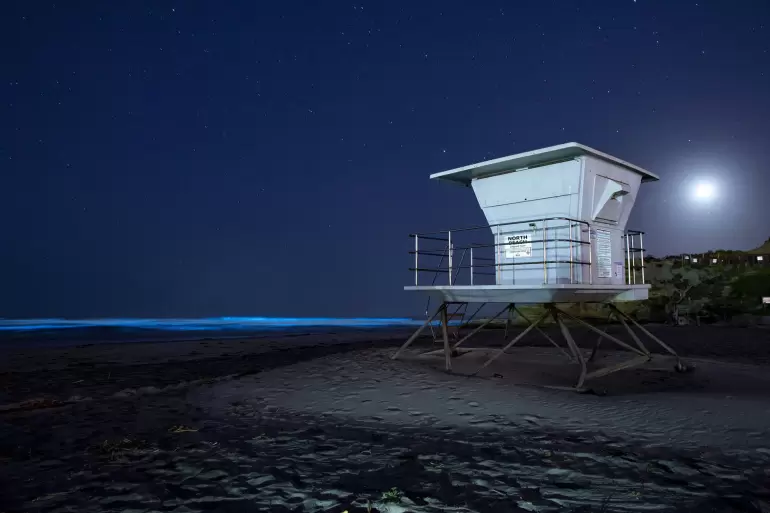 Las olas brillan con la bioluminiscencia azul de una floración de algas en las aguas del océano mientras una torre de salvavidas se sienta en una playa aún cerrada en Del Mar, California, el lunes 27 de abril de 2020 (AP Photo / Gregory Toro)