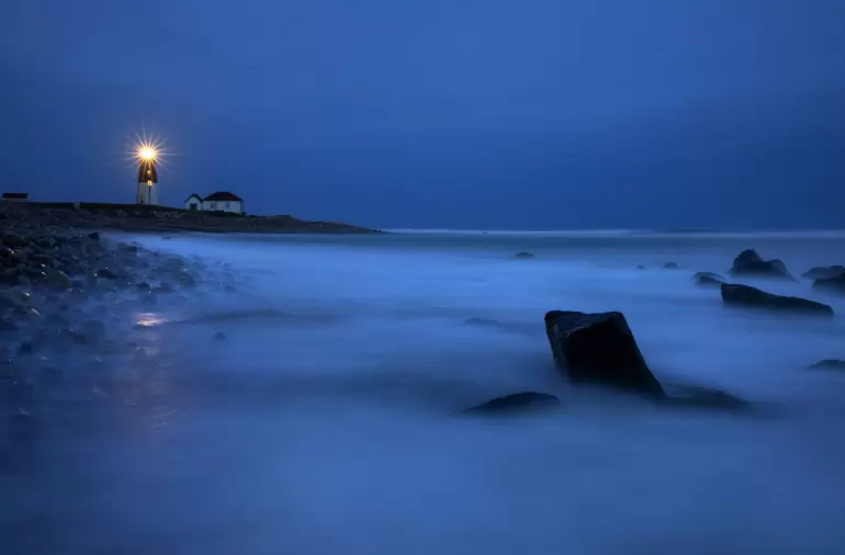Las olas bañan las rocas cuando un faro de luz brilla a través de la costa rocosa desde el faro de Point Judith en Narragansett, Rhode Island, EEUU, el sábado 25 de abril de 2020. (Foto AP / David Goldman)