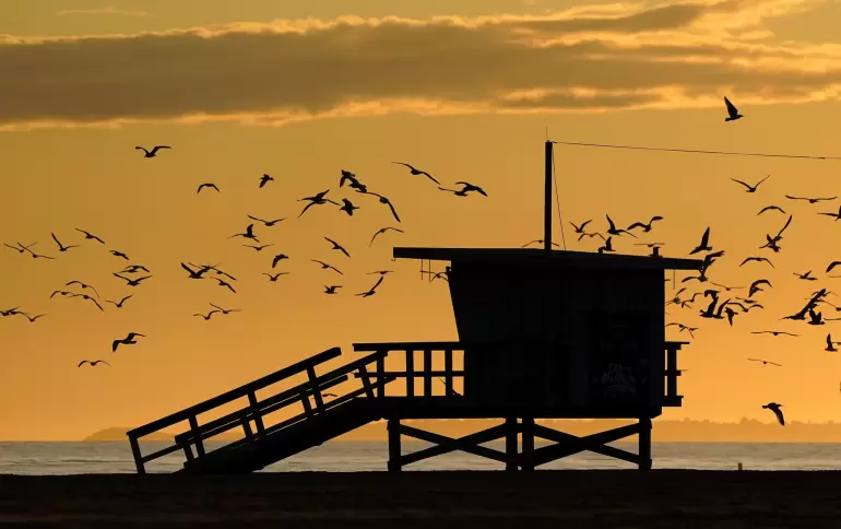Las gaviotas vuelan alrededor de una estación de salvavidas vacía en Santa Monica, California, el viernes 10 de abril de 2020 (AP Photo / Mark J. Terrill)