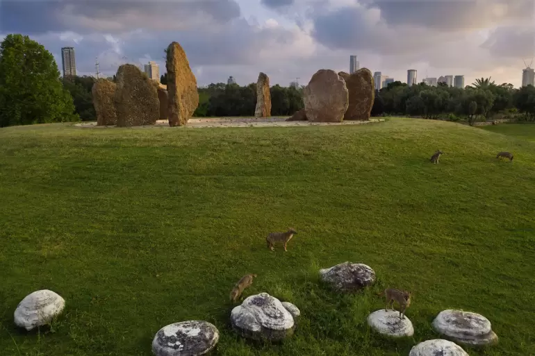 Una manada de chacales deambula por el parque Hayarkon en Tel Aviv, Israel, el jueves 23 de abril de 2020. (Foto AP / Oded Balilty)