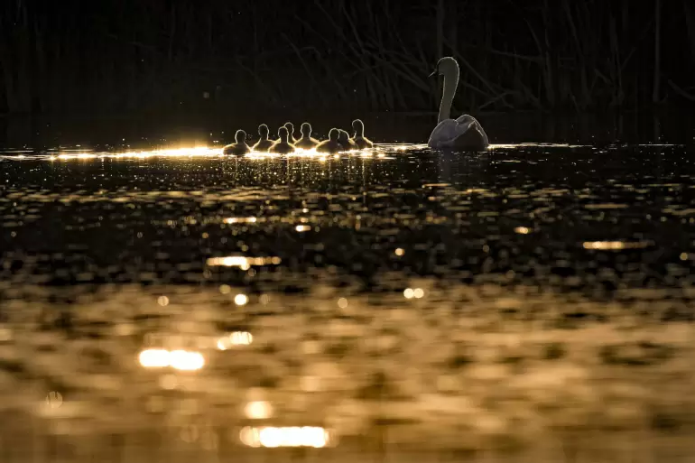 Un cisne nada junto a sus ocho pichones en un estanque en el parque natural de Vacaresti, un área urbana protegida, en Bucarest, Rumania, el lunes 27 de abril de 2020. (Foto AP / Vadim Ghirda)