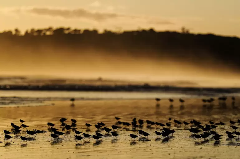 Las aves se abren camino a lo largo de la playa en Coronado, California, el miércoles 11 de marzo de 2020, (AP Photo / Gregory Bull)