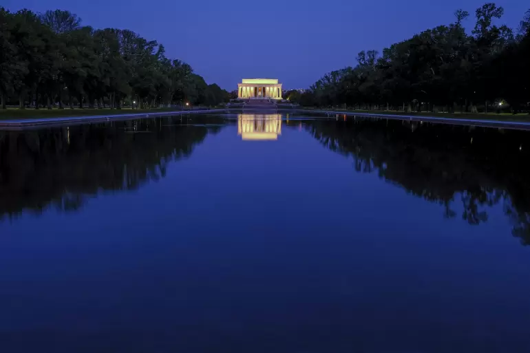 El Lincoln Memorial se refleja en las tranquilas aguas de la piscina reflectante en el National Mall en Washington, EEUU, antes del amanecer del miércoles 29 de abril de 2020. (Foto AP / J. David Ake)