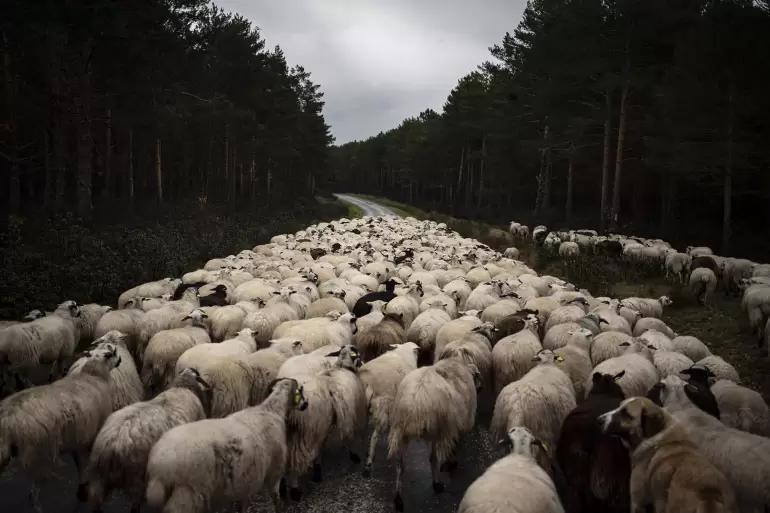 Un rebaño de ovejas se mueve en una carretera vacía cerca de Soria, España, el lunes 27 de abril de 2020. (Foto AP / Felipe Dana)
