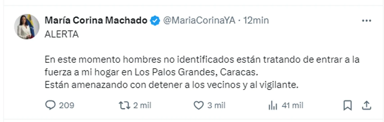 "ALERTA, en este momento hombres no identificados están tratando de entrar a la fuerza a mi hogar en Los Palos Grandes, Caracas", comenzó la líder opositora al régimen de Nicolás Maduro.