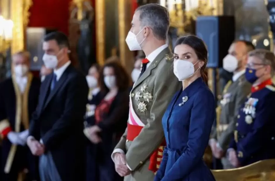 Letizia, de 49 años, lucía deslumbrante con un vestido azul marino de satén que combinó con una capa negra ideal para las temperaturas del enero europeo. Llevaba el pelo recogido, aros y algo como lo que parecía ser un nuevo piercing en su oreja izquierda. En tanto Felipe, de 53 años, lucía uniforme militar. Por la nueva ola de contagios de coronavirus, todos los invitados respetaron las medidas sanitarias de prevención y utilizaron máscaras durante la ceremonia.