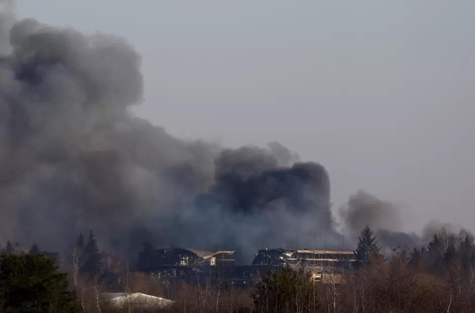 columna de humo proveniente de las inmediaciones del aeropuerto de Lviv, en Ucrania. Foto AP